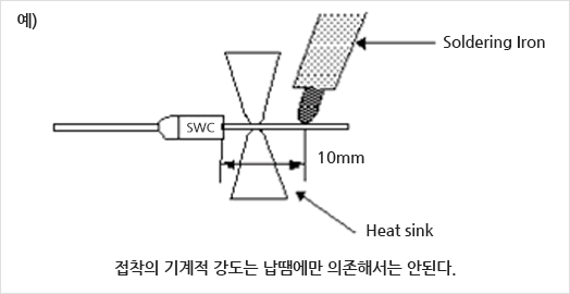 납땜 시간을 줄이기 위해서는, 온도퓨즈와 연결하기 전에 배선을 미리 납땜(pre-soldering) 하는 것이 좋습니다. 납땜 중에는 플라이어(pliers) 등 금속 공구로 온도퓨즈 근처의 리드를 잡아 열을 흡수하고 온도퓨즈 본체로의 열 전달을 차단해야 합니다. 가열 시간은 3초를 초과하지 않도록 주의하십시오.