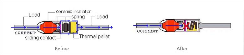 S.W.C 温度保险丝由可动触点、 弹簧、可熔体构成。 在温度保险丝启动之前电流从左侧引线流向可动触点,通过金属外壳向右侧引线流动。在外部温度达到预定温度时可熔体熔化,压缩弹簧会变松。即弹簧膨胀,可动触点与左侧引线分离。回路被打开,可动触点与左侧引线间电流被切断。